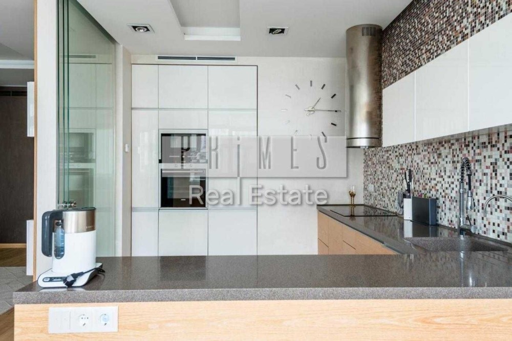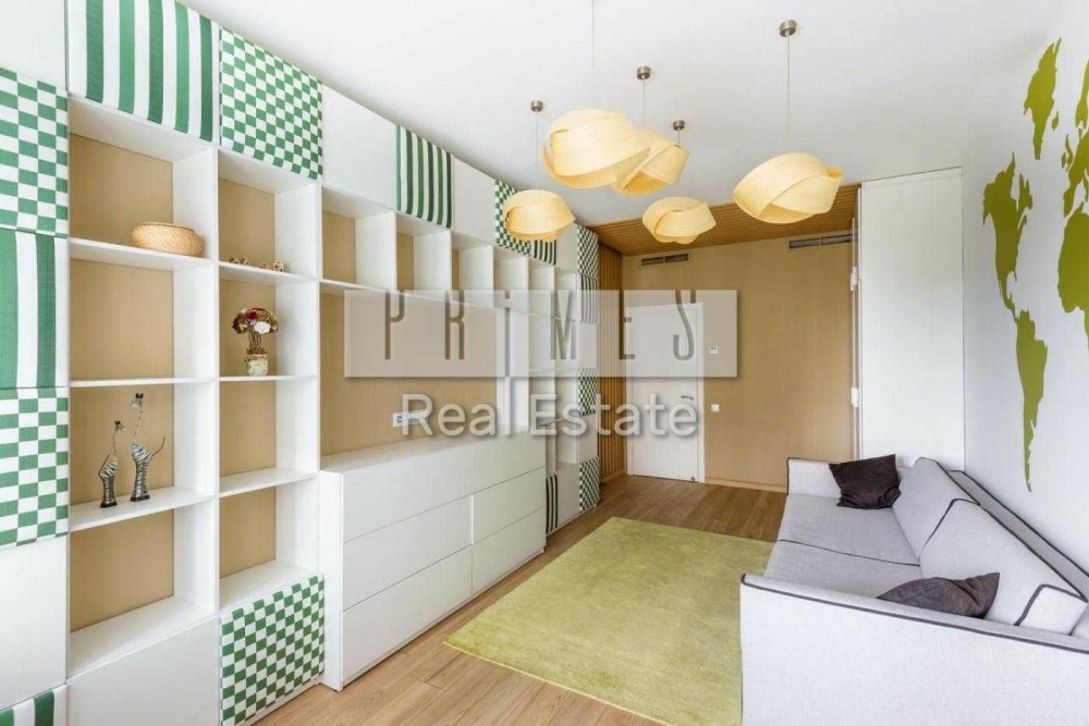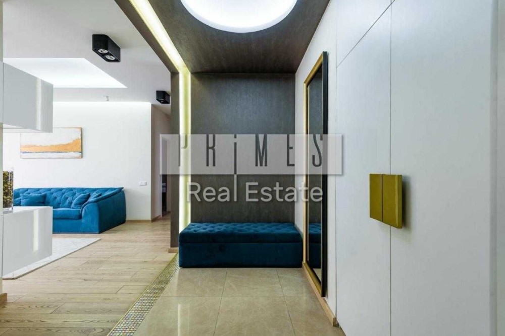 Опис: Квартира облаштована за найвищими стандартами з використанням якісних матеріалів. Дизайнерський ремонт включає стильні меблі від сучасного виробника та сучасну техніку від провідних виробників. У квартирі передбачено та вбудовано велика кількість місць зберігання. Вікна виходять у двір та на комплекс. Дитяча: простора, повністю облаштована, має зону для сну та відпочинку, робочу зону та простір для ігор. Має вихід на балкон. Спальня: затишна, облаштована сучасними якісними меблями, велике ліжко. У спальні організовано місце для роботи, а також зона з туалетним столиком. Є свій гардероб та власний санвузол. Кухня-вітальня: розділена на зону приготування їжі (з вбудованою технікою ), обідню зону з великим столом та зону відпочинку з диваном, кріслами та кавовим столиком. Світла та затишна. - **Санвузол 1**: господарський. Для комфортного використання (в т.ч. одночасно 2-х осіб). Сучасний, з теплою підлогою, великою ванною (180см). - **Санвузол 2**: загальний. Сучасний, містить душ та якісну техніку. - **Коридор**: великий та просторий. Має багато місць зберігання. Зручний для щоденних сімейних «зборів».