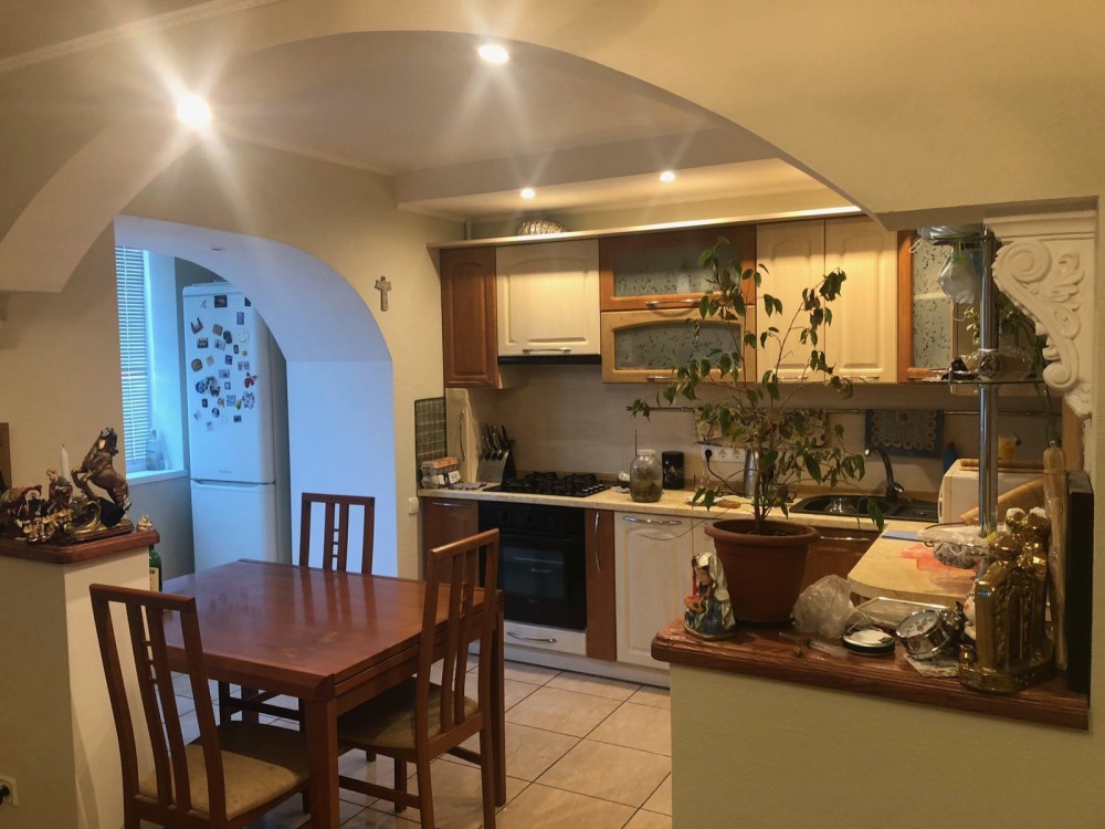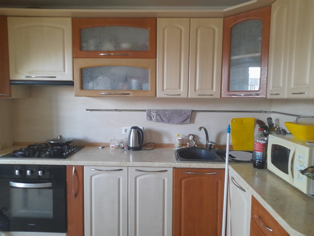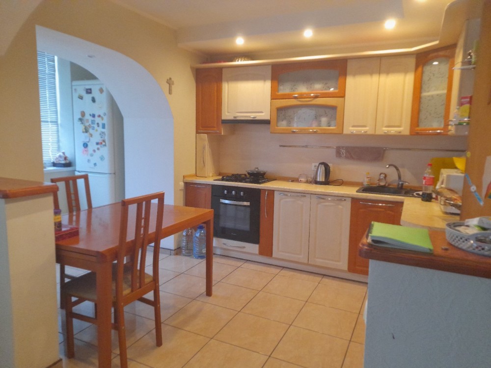 меблі. Є плита, духовка, посудомийна машина, мікрохвильова піч, зроблено теплу підлогу. Кухня поєднана із залом.