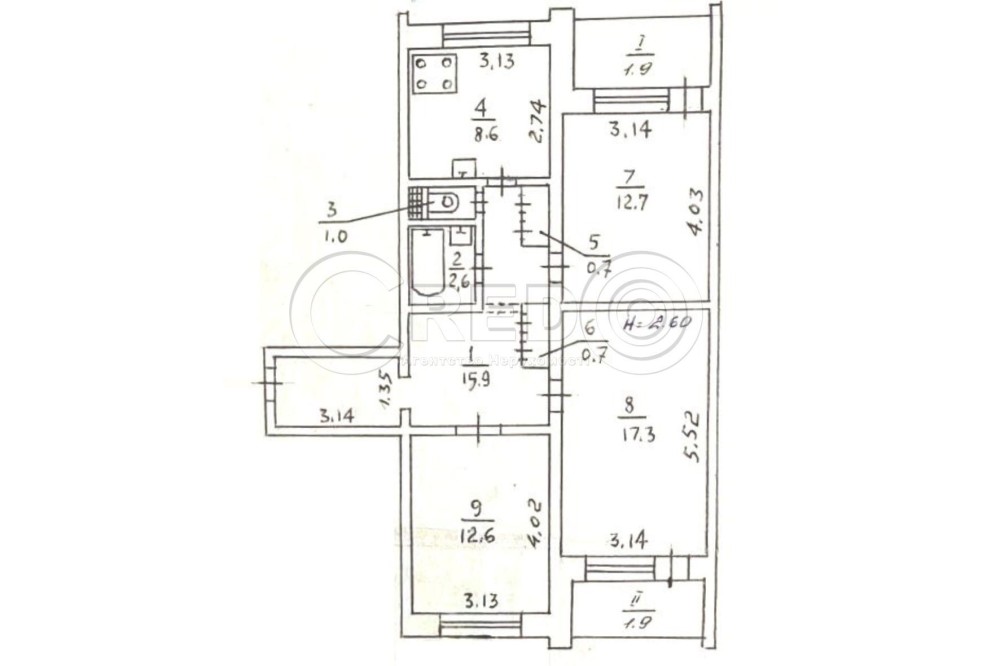 - кімнати 17,3 + 12,7 + 12,6 м.кв.