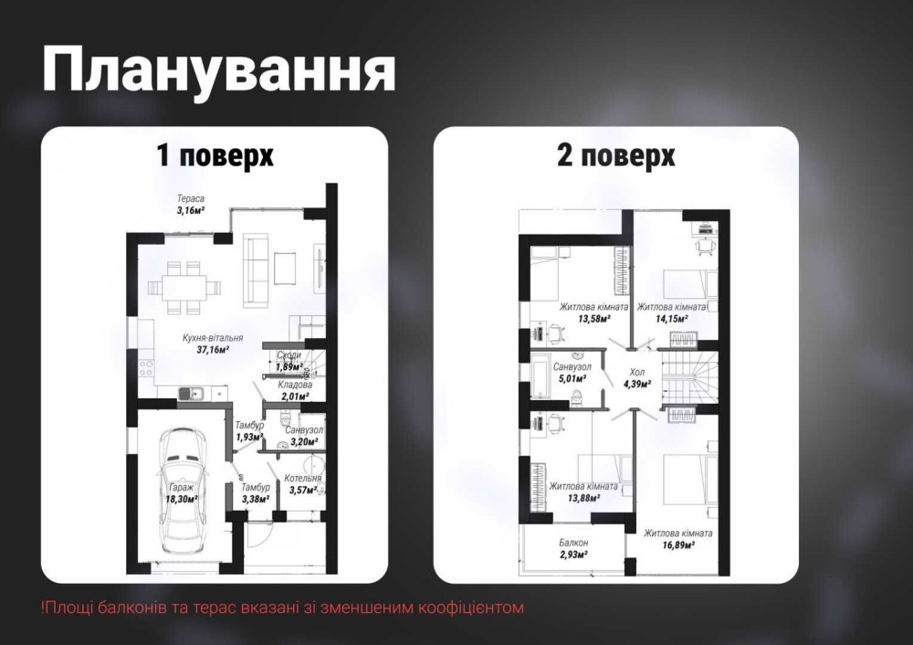 - 1-й поверх: кухня-вітальня 37,16м², комора 2,01м², гараж 18,30м², тамбур 3,38м² та 1,93м², санвузол 3,20м², котельня 3,57м², тераса 3,16м², сходи 2,0м².