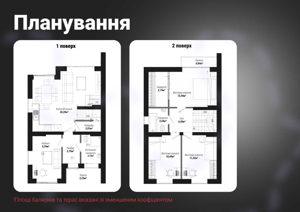 - 2-й поверх: три кімнати 12,44м²/11,32м²/10,49м², санвузол 3,54м², хол 4,28м², гардероб 5,19м², балкон 0,84м².