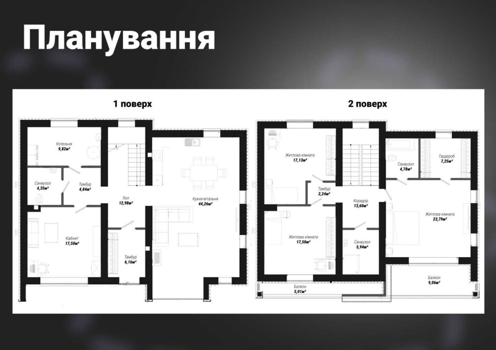 - 1-й поверх: кухня-вітальня 44,26м², хол 12,98м², тамбур 6,16м² та 4,84м², кабінет 17,50м², котельня 9,82м², санвузол 4,35м²