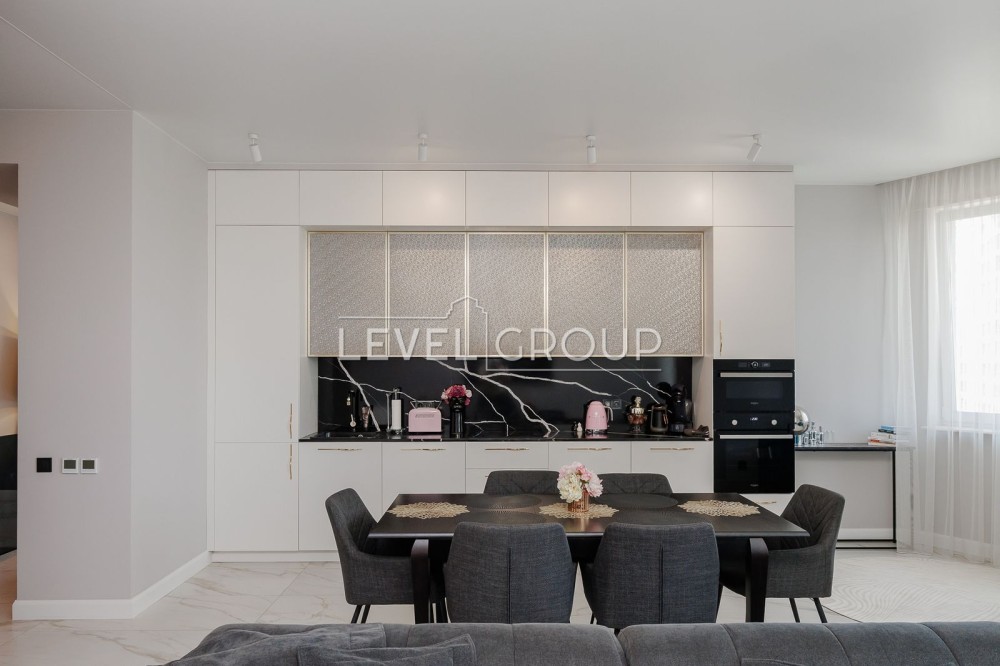 Побутова техніка: Посудомийна машина, сушильна машина, холодильник, варильна панель, мікрохвильова піч, духова шафа, пральна машина; кондиціонер, підігрів підлоги, сигналізація, тераса, гардероб