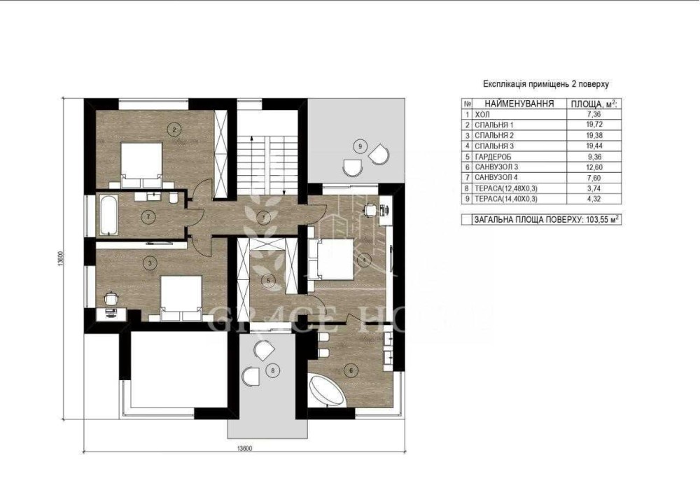 Планування: чотири затишні спальні, чотири санвузли, велика кухня-гостина та тераса. В будинку для Вашої зручності передбачені два гардероби та технічне приміщення.