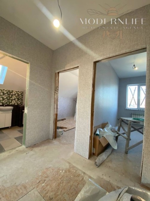 • Другий поверх (60 м²): три кімнати та санвузол, батареї підключені; кімнати під чистову обробку — залишилось поклеїти шпалери та вставити двері, все інше вже готово