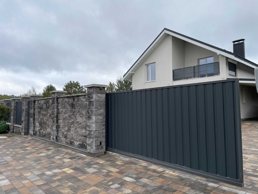 Паркан 2,2м з блоків Золотий Мандарин. Озелення зони при дорозі. Відкатні ворота на автоматиці.