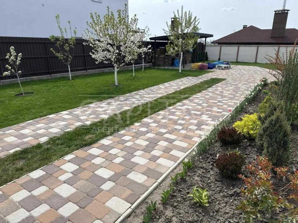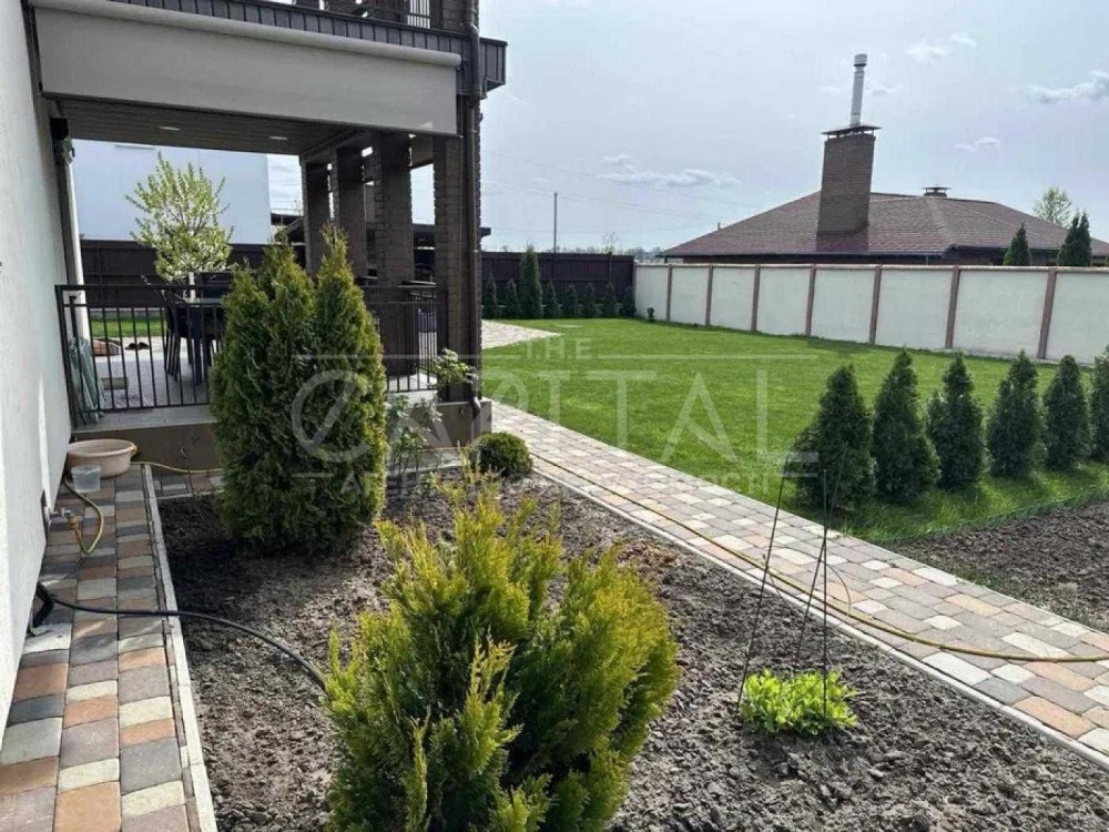 Двір з доглянутим газоном має квітники та дерева, що забезпечує затишок. Тут також є зона відпочинку та тераса, де ви зможете насолоджуватися красою саду та свіжим повітрям.