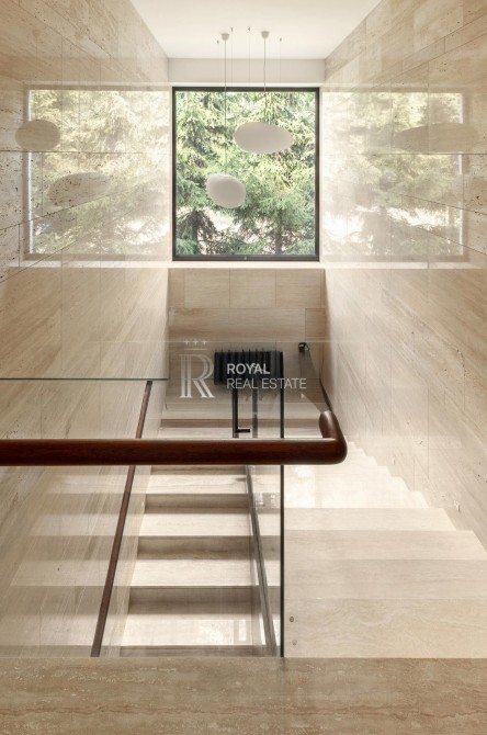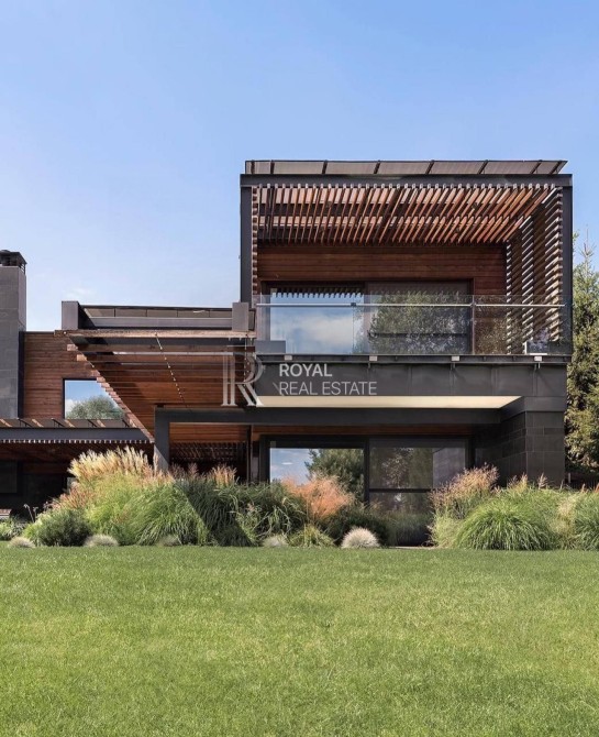 Фасад облицьований натуральним гранітом та ліственицею, що надає резиденції статусного та сучасного вигляду.