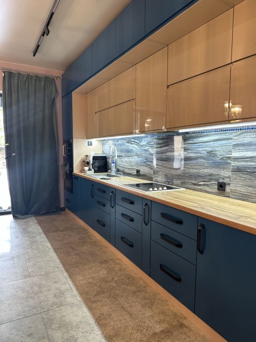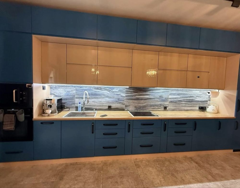 Кухня обладнана вбудованою технікою: електроплитою, духовою шафою, мікрохвильовою піччю, холодильником, посудомийною машиною. Є кавомашина.