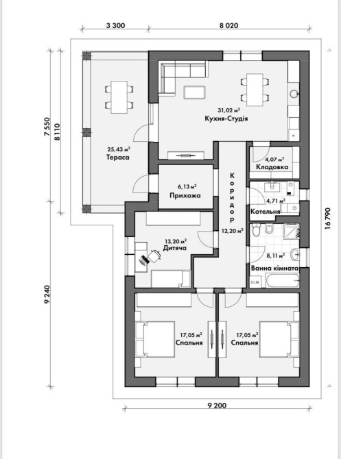Кухня студія, 3кімнати, санвузол, коридор, тераса, кладова, котельна, призожа