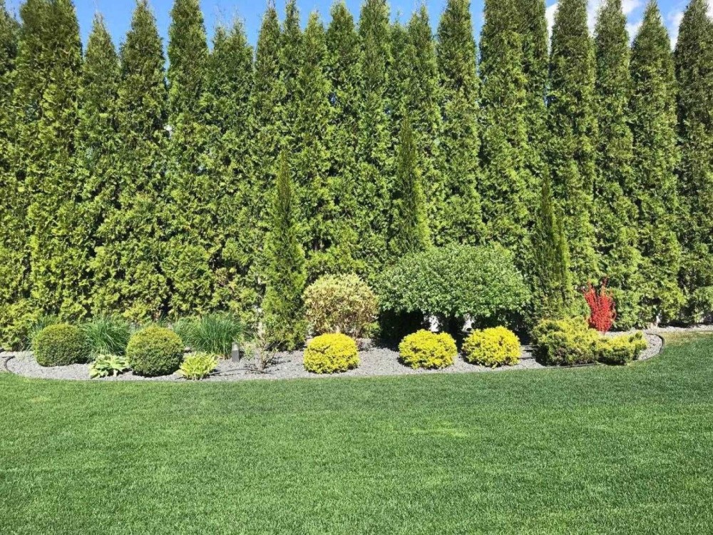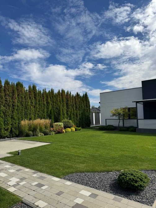Озеленення виконане повністю, фруктовий сад, декоративний паркан з туй висотою 5 м + 3 м монолітний паркан по периметру.