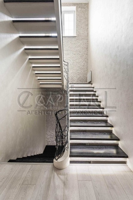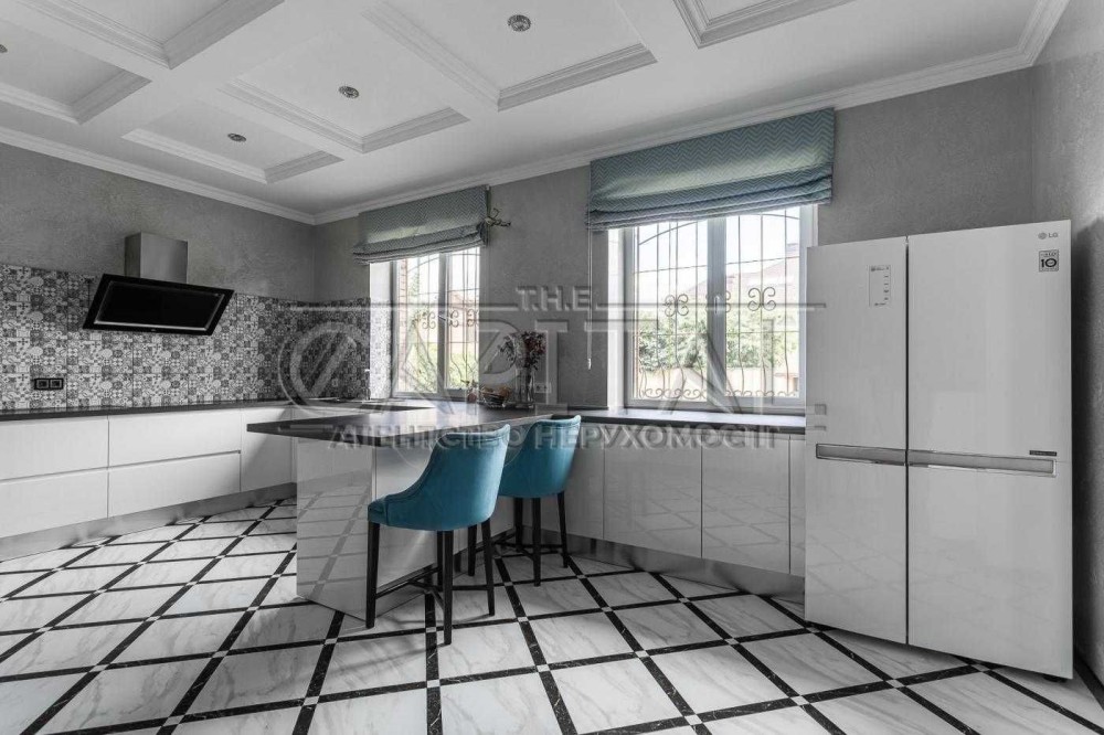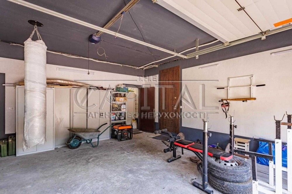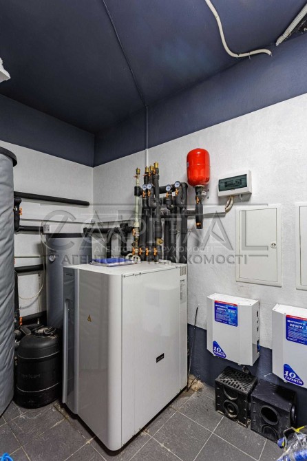 - на першому поверсі вхідна зона з великою шафою для зберігання верхнього одягу, велика та простора кухня-вітальня з каміном та виходом на засклену терасу 42 кв.м., гостьовий санвузол з душевою кабіною, вхід в опалювальний гараж на 2 автомобілі з автоматичними воротами, в гаражі дві котельні кімнати: геотермальний котел, твердопаливний котел, електричний двуконтурний котел, емність для нагріву води, на 1 тонну води, що надає змогу будинку довше тримати тепло, фільтра для грубої очистки води. У дворі ще можна розмістити декілька авто.