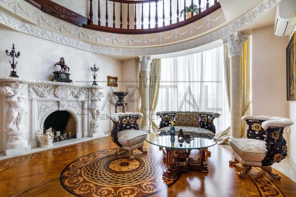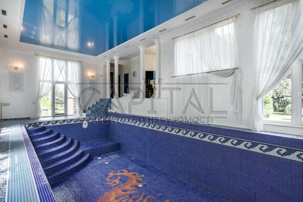 На першому поверсі знаходиться велика дизайнерська вітальня із каміном та вишуканими елементами декору, зона кухні із якісною технікою, гостьовий санвузол, та зона басейну