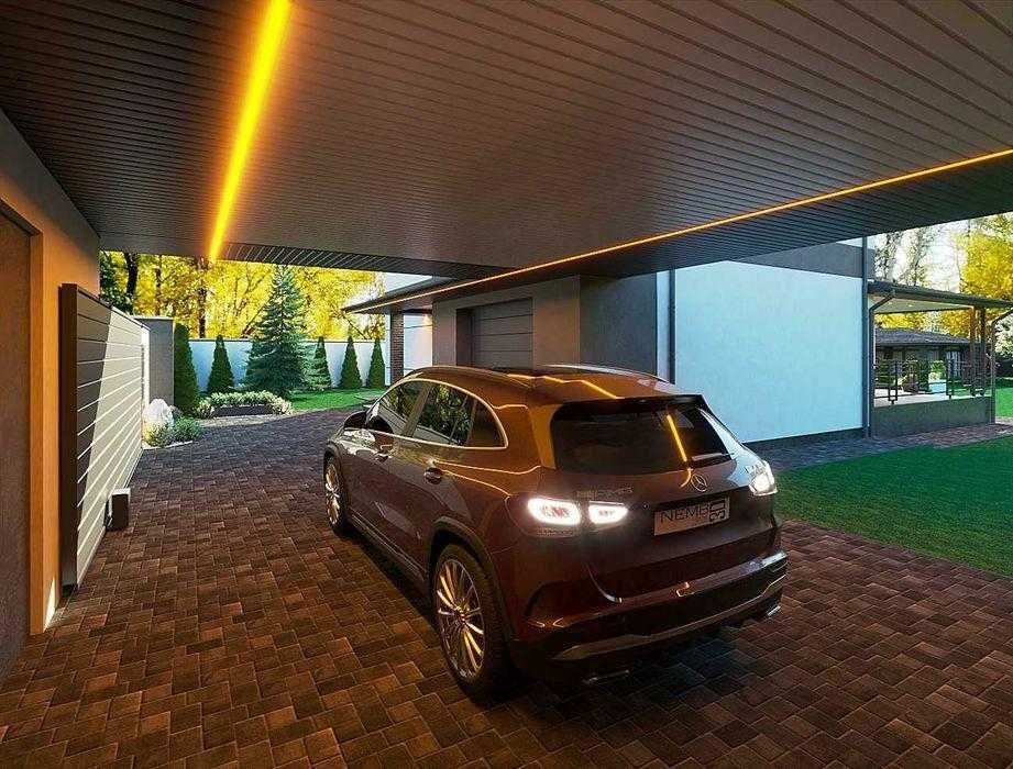 • I поверх: вхідна група, серце будинку – кухня-вітальня з виходом на терасу, гостьова ванна кімната та виокремлений вхід до гаражу + кімната з інженерними системами, вхід до якої також можливо з заднього двору будинку.
