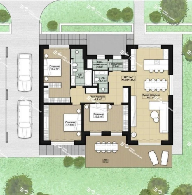 Планування: 3 спальні, кухня студія з виходом на терасу, два санузла, гардероб, тех приміщення.
