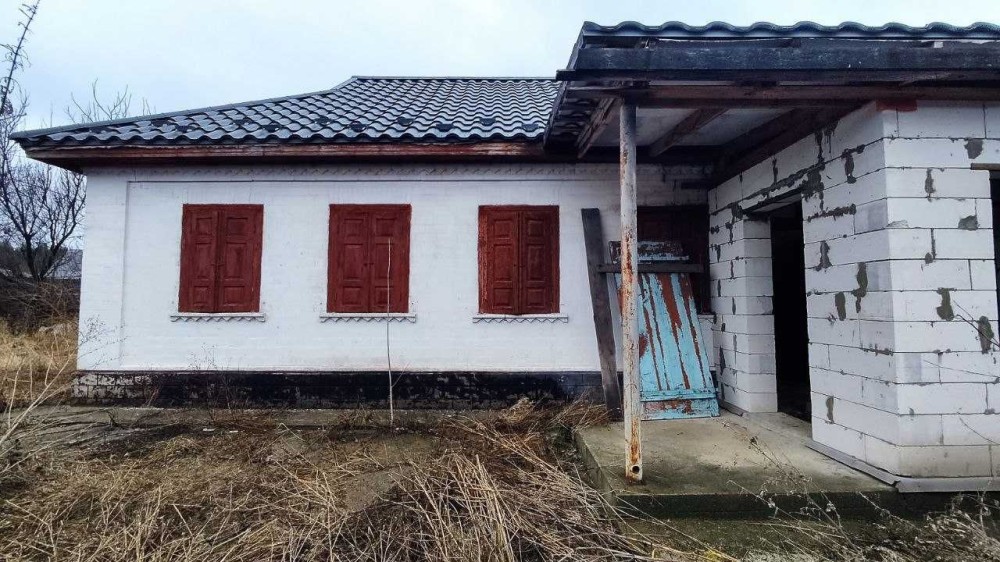 Стіни будинку глинобитні, обкладені цеглою, з цегляними перестінками, дерев'яною підлогою та вікнами. У будинку частково і якісно вже здійснено низку ремонтних робіт: повністю перекрито дах з металочерепиці, по всьому периметру будинку укріплено фундамент, перебудовано веранду, ванну кімнату, котельню; розібрано піч (оскільки планувалося встановлення системи парового опалення).