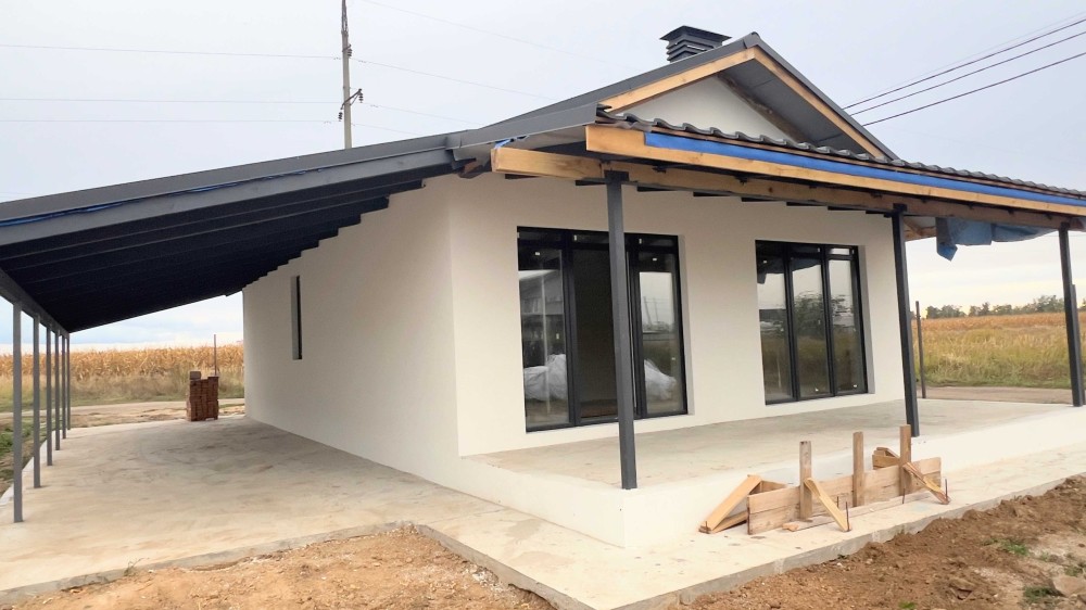 Стіни з газоблоку товщиною 35 см, утеплення пінопластом 10 см, дах з металочерепиці з утепленням мінватою.