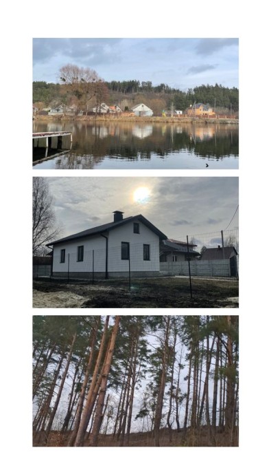 БЕЗ%, будинок 190м2, Віта Поштова, СТ «Хуторець», навколо ліс, 9 км Київ та м.Теремки, Одеська траса Загальна площа будинку - 190м2. Площа земельної ділянки 10.38 соток. Будинок знаходиться в затишному та мальовничому місці, між Вітою Поштовою та Тарасівкою, оточений дорослим хвойним та листвяним лісом, з власним виходом на озерце. Побудований на пагорбі, дає можливість насолоджуватись неперевершеним видом на ліс та озеро, крізь великі панорамні вікна будинку 24/7. Раціональне та комфортне планування, великі, світлі та просторі кімнати з панорамними вікнами. 1й поверх: столова – вітальня, кухня, гердероб, санвузол, гараж, котельня; 2й поверх: три окремі спальні кімнати, санвузол. Об’єкт для поціновувачів заміської тиші та ранкових піщих прогулянок!