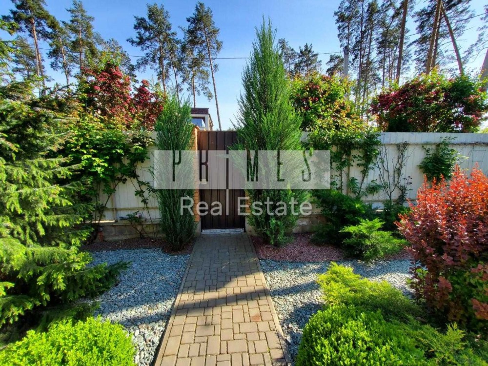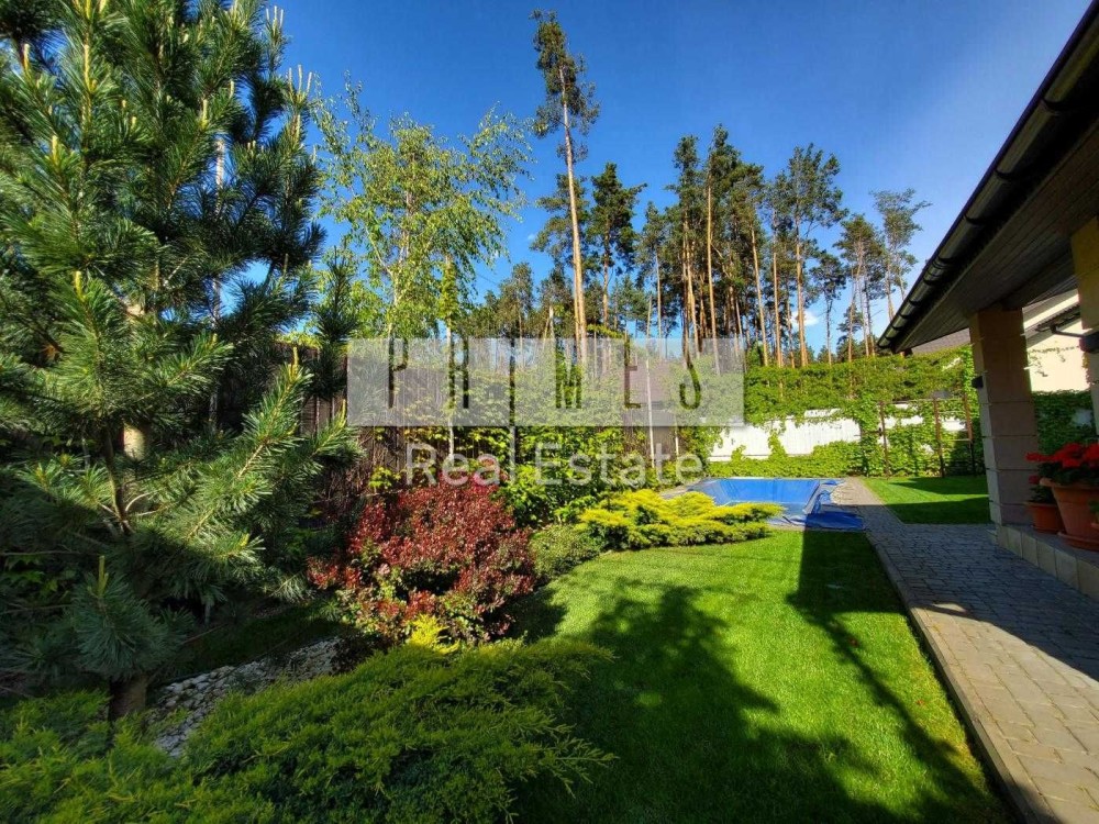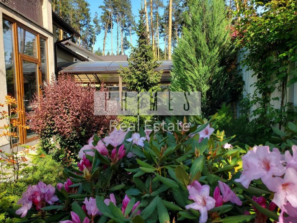 Земельна ділянка площею 5 соток з ландшафтним дизайном (дорослі декоративні дерева, газони, клумби з квітами) та системою автоматичного поливу.