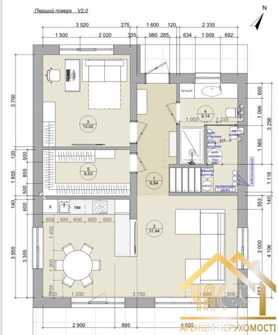 На першому поверсі — простора кухня-студія з вітальнею, гостьова спальня або кабінет, санвузол, котельня та гардероб.