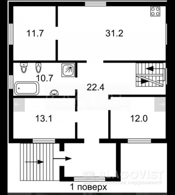 • 1-й поверх: передпокій, коридор, 2 кімнати, санвузол, простора вітальня, кухня, кладова під сходами.