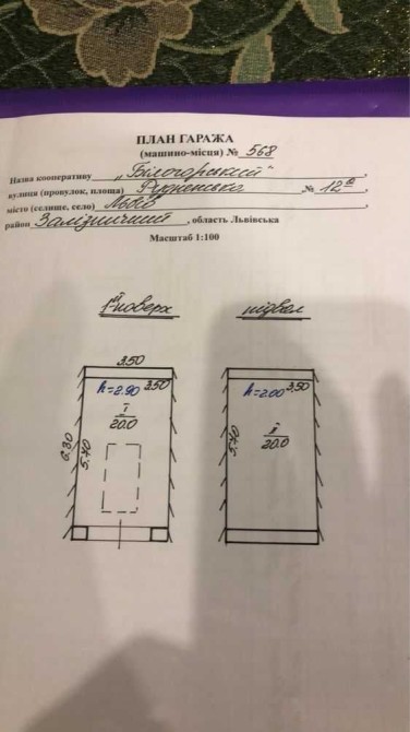 Продам свій підземний гараж у багатоярусному гаражному комплексі з адміністративними приміщеннями адресую м. Черкаси, вул. Праведниці Шулежко (Пушкіна) 100/1. Це на розі вулиць Пушкіна та Гоголя (Google map 49.448872, 32.048071). Його конкурентні переваги: + продаж від власника, без комісії, документи на руках; + це повноцінний капітальний підземний гараж (фундамент – бетонні блоки, стіни – цегла, перекриття – залізобетон, підлога – тротуарна бруківка поверх бетону), тобто Ваш авто і крам будуть в повній безпеці, як в бомбосховищі; + територія комплексу закритого типу, охорона на в’їзді 24/7 + відеоспостереження, є протипожежна сигналізація; + взимку мінімальна температура +5⁰, влітку максимальна +25⁰, і це без утеплених воріт. Працює пасивна витяжка, її достатньо щоб вологе висихало; + пристойні розміри (довжина – 5.86 м, ширина – 3.28 м, висота – 2.5 м, площа – 19.2 м2). Увага! Залізні ворота на всю ширину гаража. Поряд з авто можна розташувати стелажі; + до гаража є зручні 2 окремі заїзди (головний - через пост охорони та додатковий – через зовнішні ворота з пультом); + стабілізована електромережа стандартної потужності, 2 розетки та 2 стельові світильники. Індивідуальний електролічильник на щитовій, яка знаходиться через один гараж. Якщо Вам потрібен надпотужний ввід для чогось, то прокласти окремий силовий кабель можна геть без складнощів; + на відстані 200-300 м від кооперативу знаходяться зупинки громадського транспорту, центральний проспект міста, торгівельні центри тощо; + гараж після будівельників як є (тротуарна бруківка на бетоні, стіни первинно потиньковані), з фото це видно. Ви зможете зробити все на свій смак, нічого не переробляючи! + пульта від воріт ДОДАТКОВОГО зовнішнього в’їзду можна придбати у голови кооперативу. Ціна – 18500 $. Нотаріальні витрати та податки з заявленої вартості, час огляду та інші питання за домовленістю. Телефонуйте та купуйте, гараж серйозний: +38 067 470 3530 Олег.