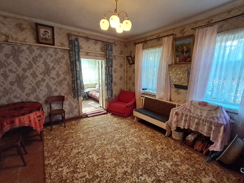 Дом в с.Заболотье, Шосткинский район. Общий вид с огорода (фото 1) Слева деревянный сарай ~ 24м2 (фото 2) Возле сарая погреб (фото 3) Летняя кухня ~ 10м2 (фото 4) Возле летней кухни есть скважина под глубинный насос (фото 5) Жилой дом ~ 50м2 (фото 6) Прихожая (фото 7-8) Коридор (фото 9) По коридора прямо сразу веранда (фото 10-11) Налево по коридору проходная комната с половиной грубки, двумя столами и счетчиком электроэнергии (фото 12-15), дальше комната со второй половиной грубки (фото 16-19) Направо по коридору кухня с печкой и лежаком (фото 20) Пол везде хороший. Долгов нет. Есть сад и плодовые деревья. Состояние все на фото.