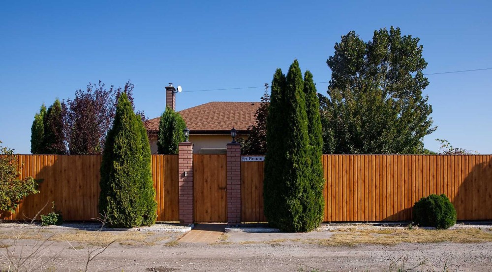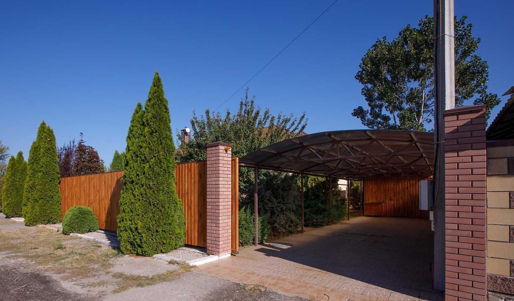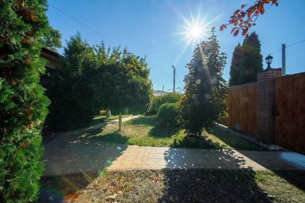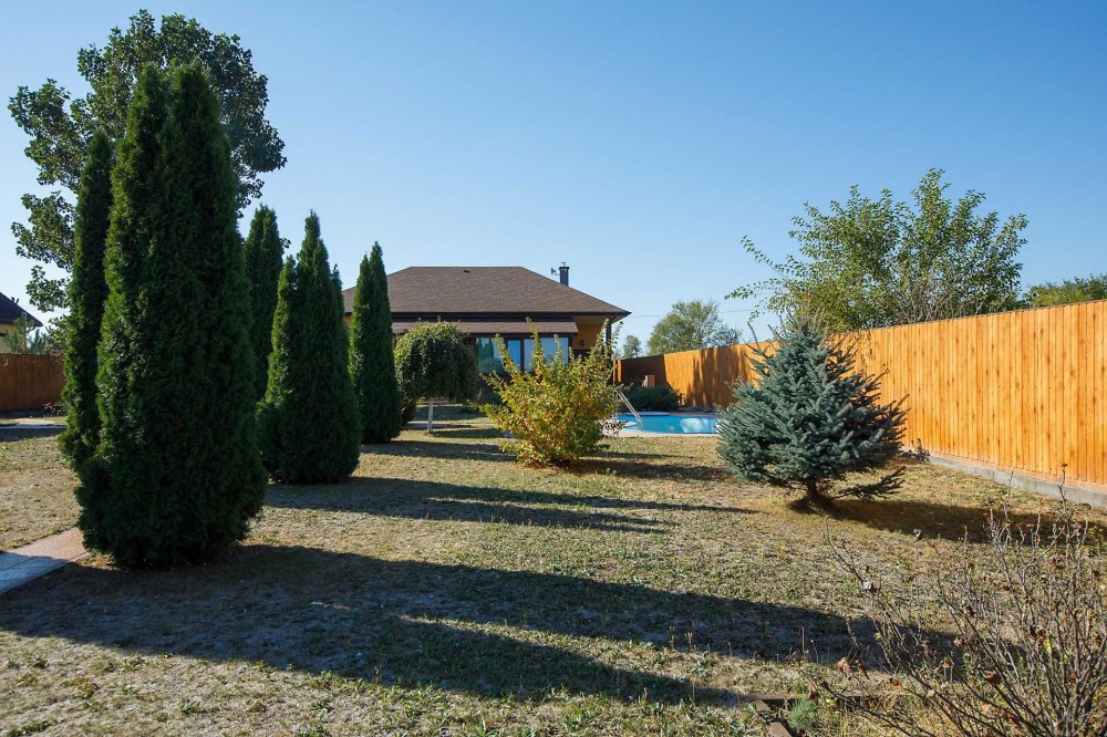 На передньому подвір'ї розташований навіс на 2-а авто та підсобне приміщення для зберігання садового інвентарю. На задньому подвір'ї розташована альтанка з мангальною зоною, також розміщений стаціонарний басейн. Вся територія земельної ділянки засіяна газоном, зроблений автоматичний полив, насаджено багато хвойних та декоративних дерев, створюючи атмосферу власного оазису.