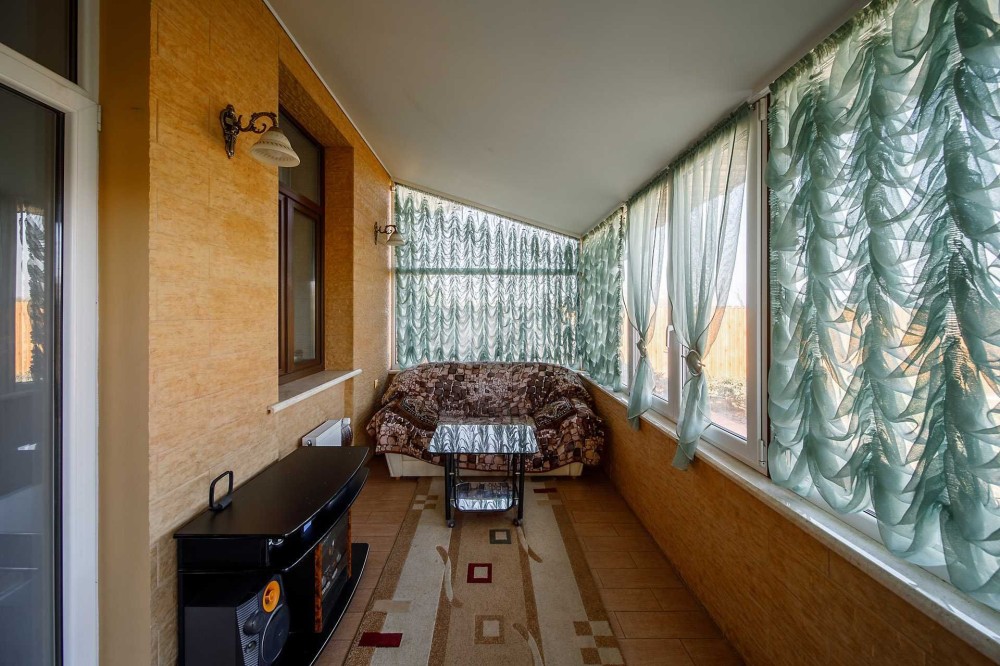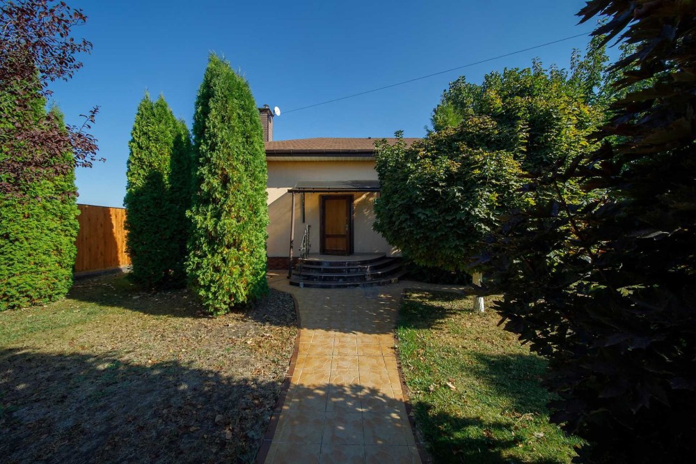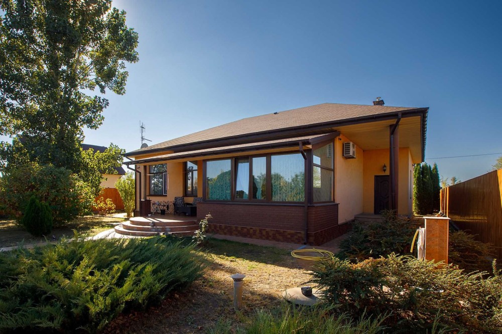 Матеріали зовнішніх стін: піноблоки, утеплено мінеральною ватою, облицьовано фактурною штукатуркою. Будинок одноповерховий, 3-и спальні, вітальня, кухня, 2-і вбиральні, гардеробна, зимова та літня тераси, підсобні приміщення. Використані сучасні енергозберігаючі матеріали, оселя тепла взимку та тримає прохолоду влітку. Комбіноване опалення: твердопаливний котел та електричний котел, лічильник електроенергії "день-ніч". В коридорі на кухні та у вбиральнях зроблена тепла підлога. Інтегрована система додаткового очищення води та зворотній осмос питної води. Гаряча вода від бойлера. Індивідуальну безпеку забезпечує встановлена на будинок сигналізація та відеоспостереження. Концепція авторського проекту підкреслює вишуканий стиль будинку в якому комфортно та затишно.
