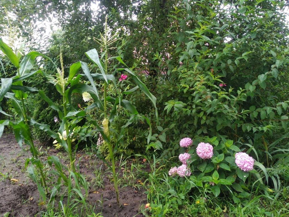 На ділянці є кілька фруктових дерев та кущів.