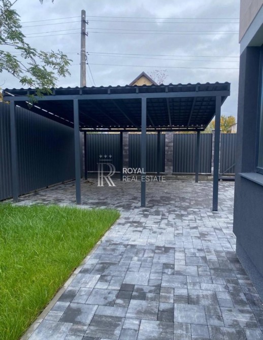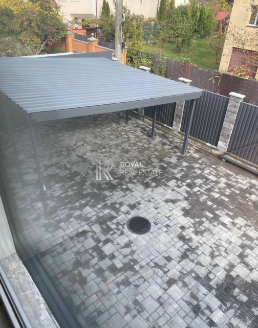 Двір з озелененням та бруківкою, металевий навіс на 2 автомобілів та парковка для 2-3 машин.
