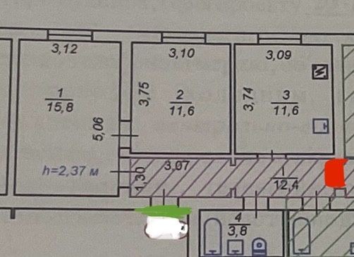 Висота приміщень - 2,37м.