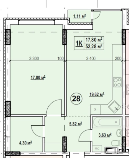 • Общая площадь 52.28 м2