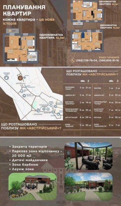 Територія комплексу закритого типу з охороною та відеонаглядом, з торгово-розважальною інфраструктурою, парковкою, дитячим майданчиком та зоною відпочинку.