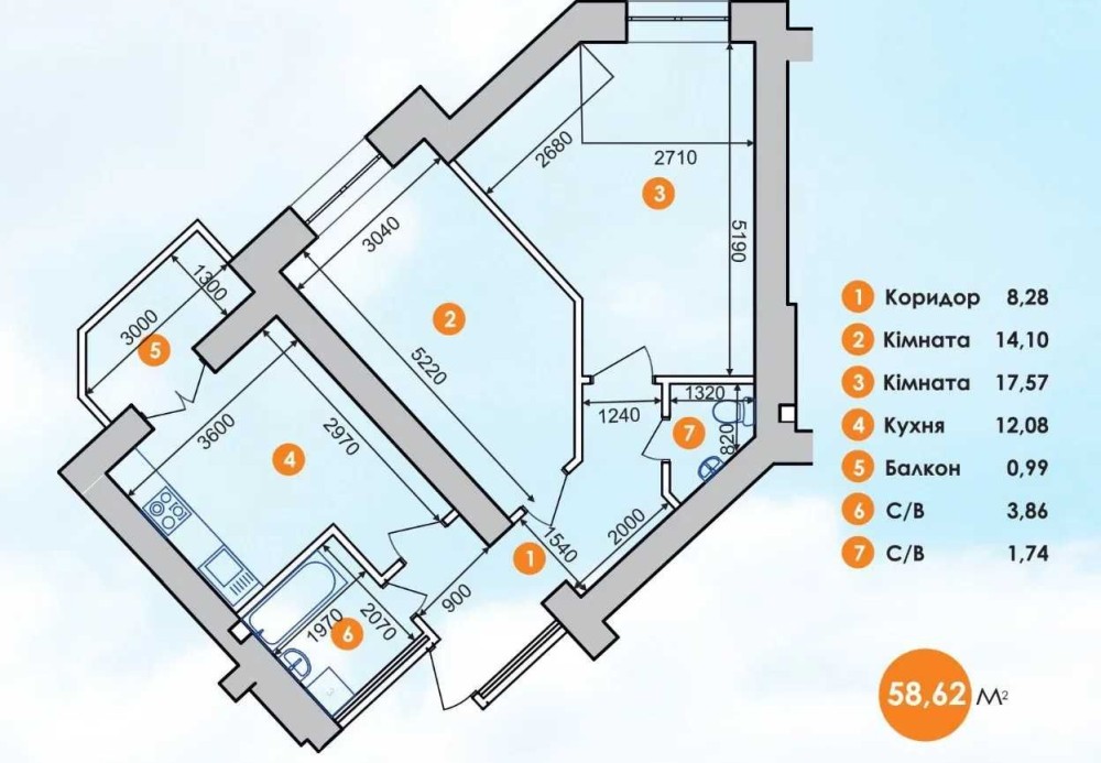 • Общая площадь 58.6 м2