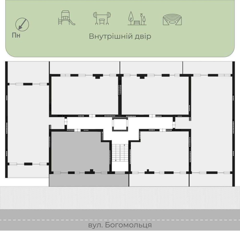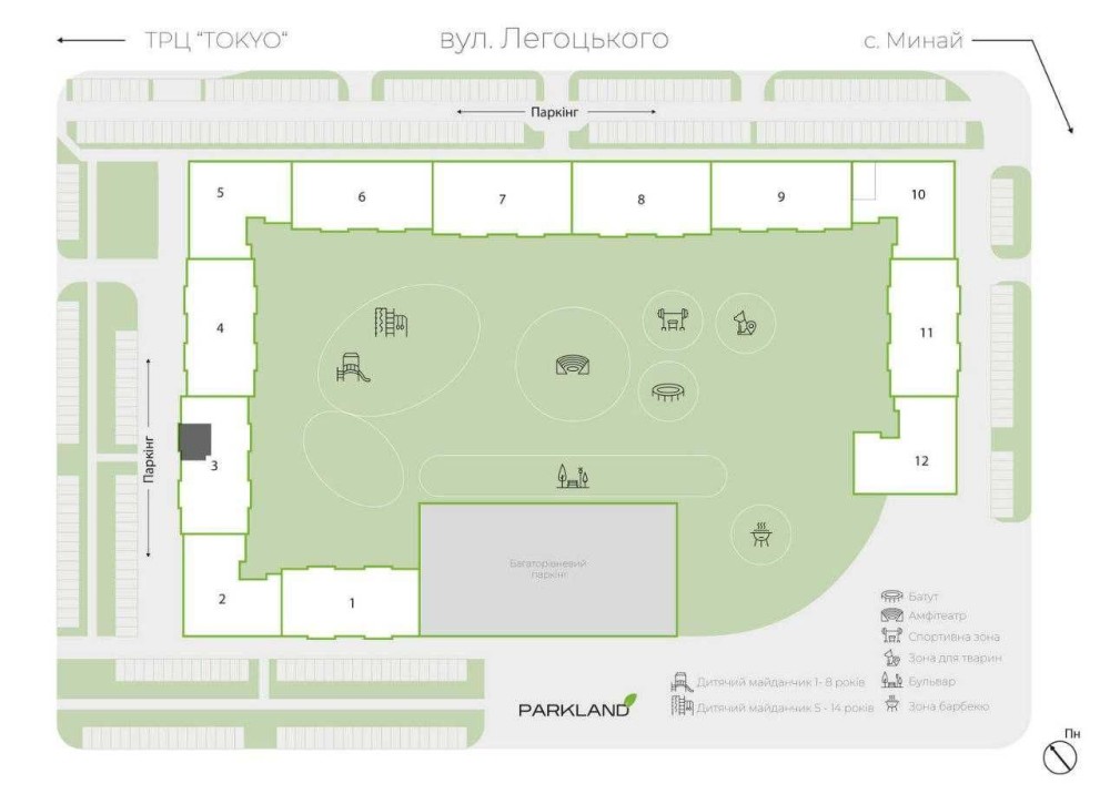 Комплекс закритого типу, без доступу автомобілів, з великою прибудинковою територією, де розташовані дитячі майданчики, спорт майданчики, зона вигулу тварин, зона для відпочинку.