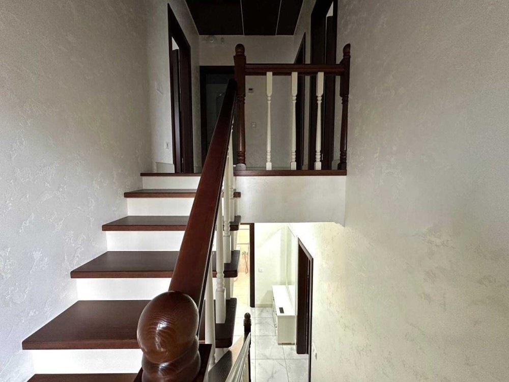 Продаж двоповерхового дуплексу в м.Буча, по вул.Ватутіна. Загальна площа будинку - 126,3м2, житлова - 60,5м2, кухня-вітальня - 29,9м2. В будинку є всі комунікації: газ, електрика (16кВт), вода - власна свердловина, каналізація - септик, встановлена система безпеки. Зроблено якісний ремонт, сучасні меблі, сходи та двері з натурального дерева. На першому поверсі: кухня-вітальня з теплою підлогою та виходом на терасу, кабінет, сан.вузол, госп.приміщення. На другому поверсі: три спальні та сан.вузол з теплою підлогою, який має ванну і душову кабіну. З однієї спальні є вихід на балкон. На другому поверсі встановлений рекуператор повітря. Ділянка загальною площею - 2,9 сотки. Доглянутий двір з декоративними рослинами та автополивом. Паркомісце на 3 авто під накриттям. Секційні ворота.