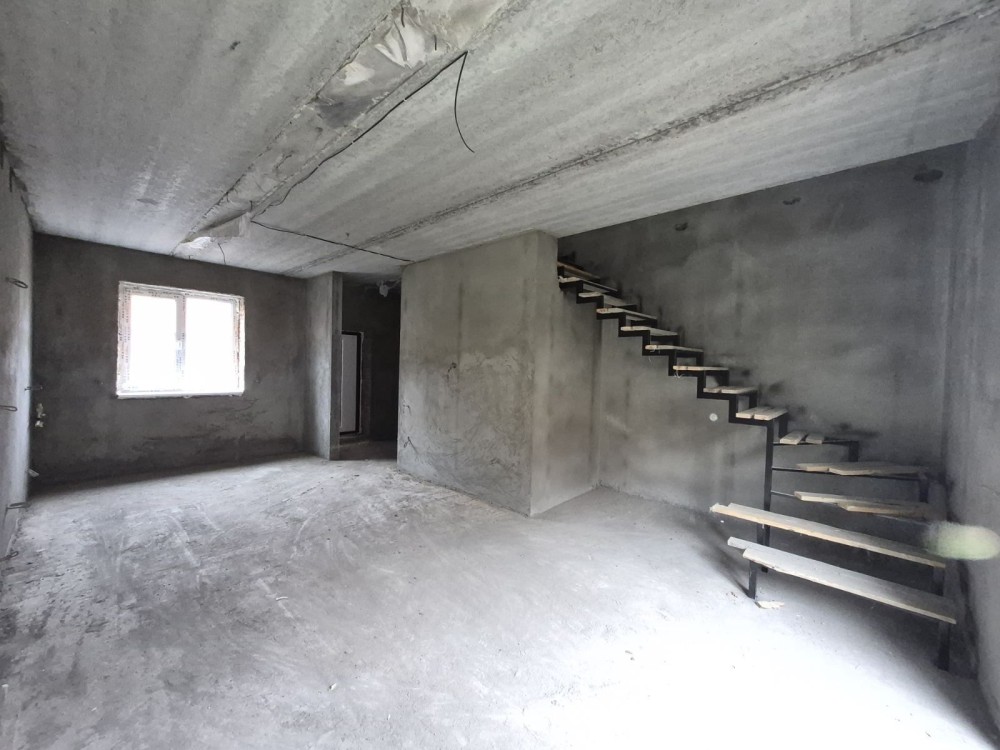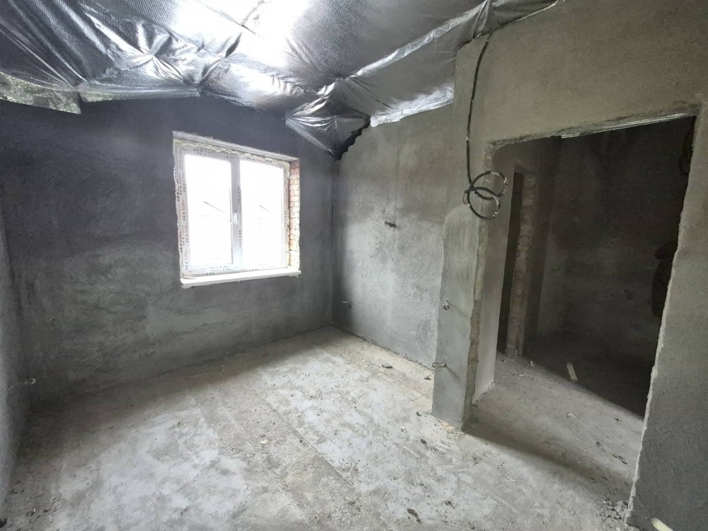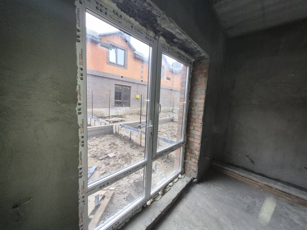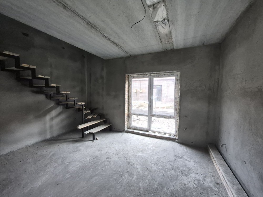 Площа будинку 75 м2, простора кухня-вітальня, дві спальні, два сан вузли, власна ділянка 1,5 сотки, паркомісце, асвальтований під'їзд, заведений газ, світло, свердловина, септик, в чорновому стані.