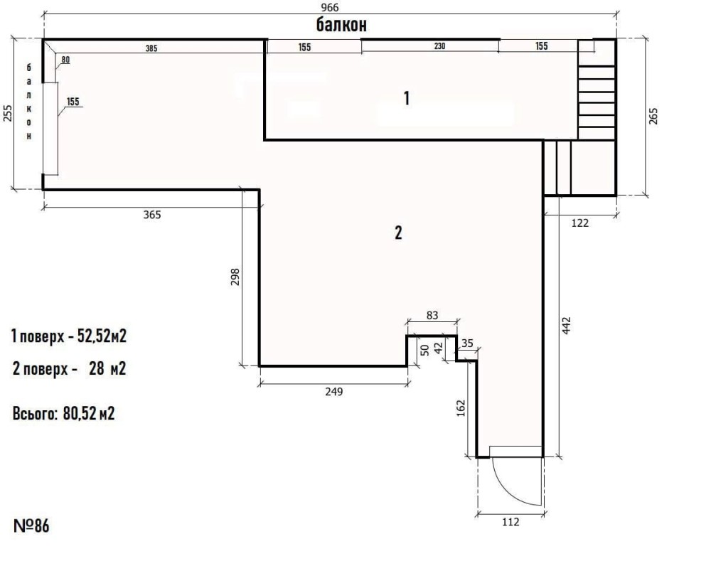 Площа первого рівня - 52.52 м2, другого рівня - 28 м2.