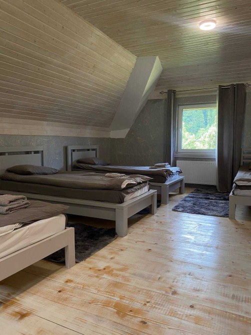 На першому поверсі є столова, кухня, санвузол, та кімната з кухнею та працівників готелю.Загалом 8 номерів на 2-му і 3-му поверсі. Як двомісні , так і для проживання великих компаній від 5 до 8 осіб. В кожному номері є санвузол.