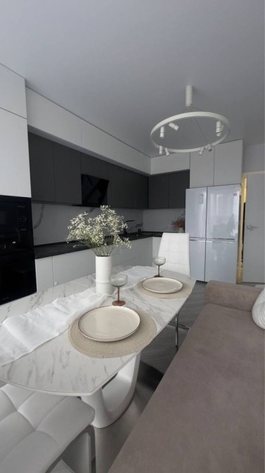 Квартира має продумане планування: простора кухня-вітальня, затишна спальня і велика гардеробна.