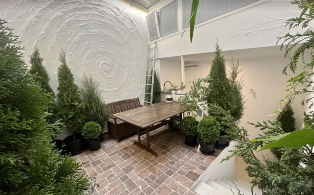В квартирі 2 спальні з санвузлами та гардеробом, кабінет, кухня із їдальнею, спортивна зона, вітальня та унікальний зимовий сад із скляним дахом. В квартирі загалом 3 санвузли,