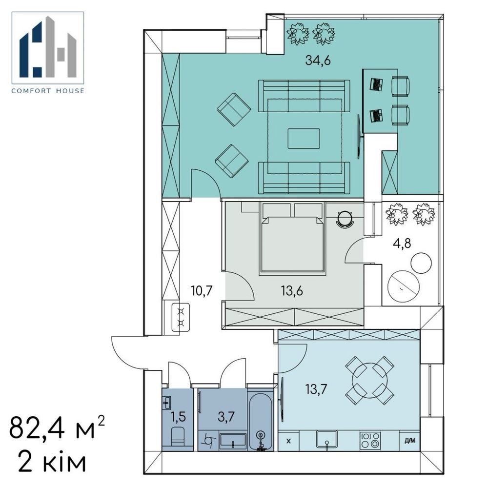 Загальна площа: 82,4 м2.