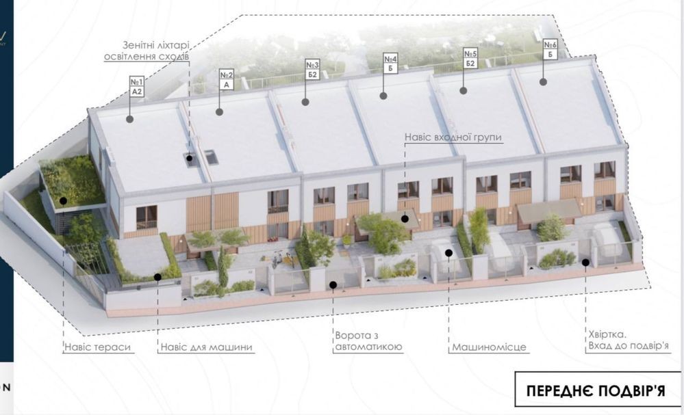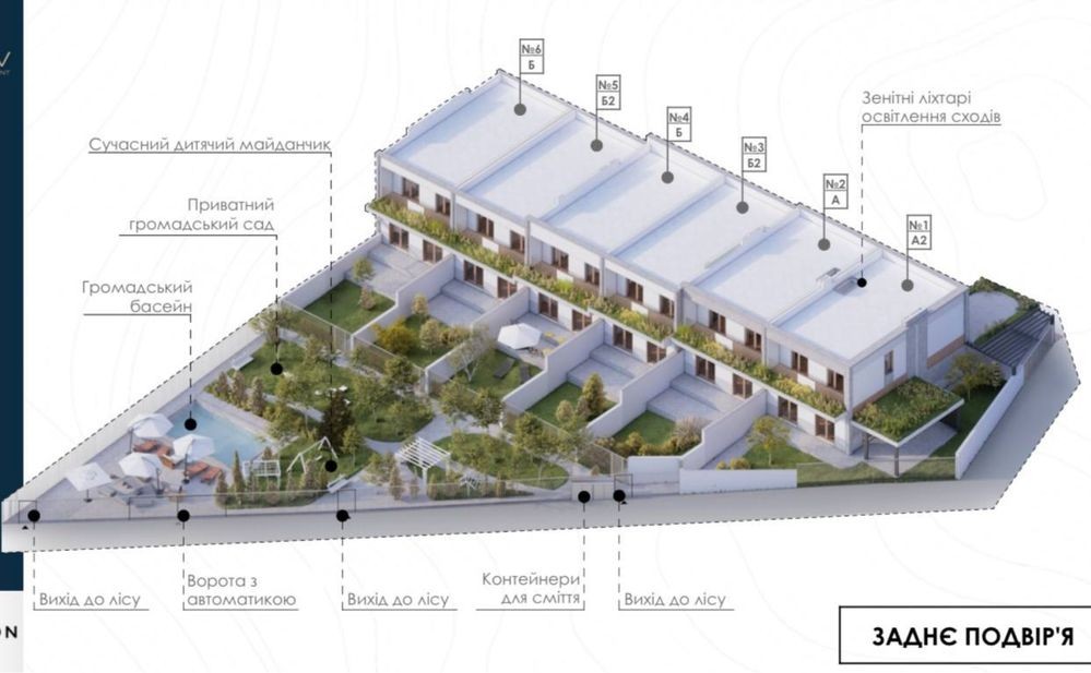 Будинки розміщені поруч із лісом, в комплексі налічується 6 котеджів, для власників яких побудований басейн, сучасний дитячий майданчик та приватний громадський сад.