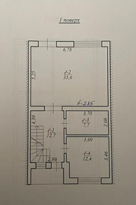 На другому поверсі є три окремі кімнати пл. 12,5 м², 19 м², та 12 м², і ванна кімната пл. 8,2 м².