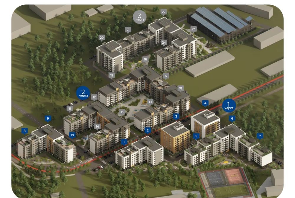 ЖК Містечко Південне, комплекс закритого типу із власною інфраструктурою, великою прибудинковою територією площею, надземним паркінгом на 600 паркомісць, сонячною електростанцією, дитячим садочком та комерцією.