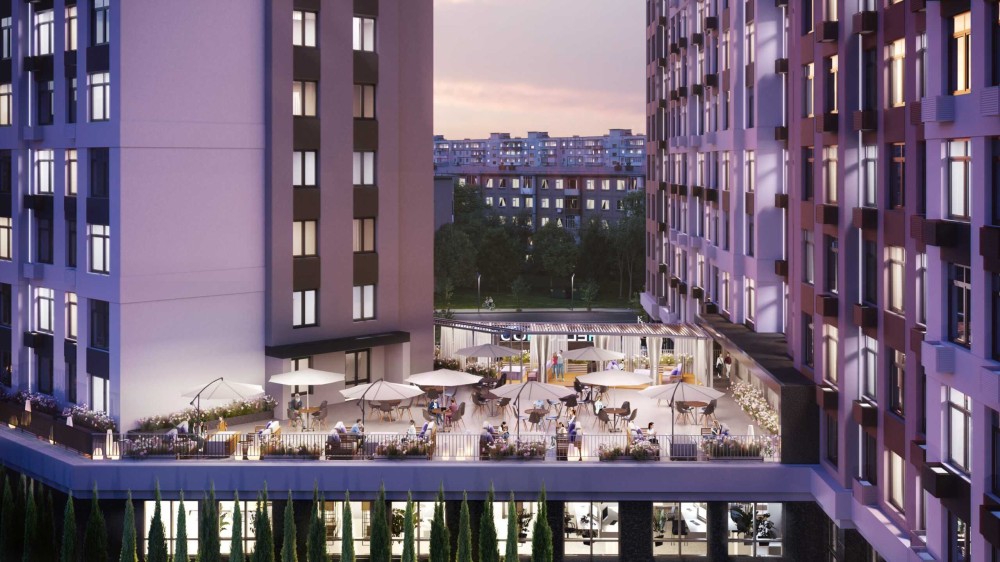 - закрита прибудинкова територія із сучасним дитячим майданчиком та лаунж-зоною на відкритій терасі кафе;