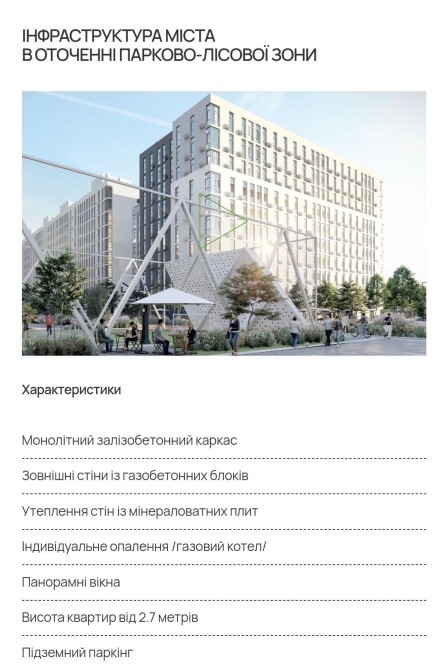 Будинок з індивідуальним газовим опаленням (двохконтурний газовий турбінний котел). Будинок монолітно-каркасний - пінобетон 300 мм, утеплення - мінеральна вата, засклені балкони. Є різні планування квартир.