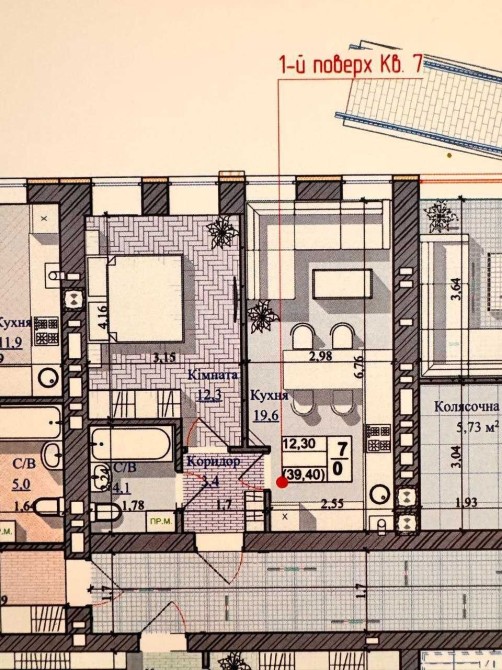 1-й поверх 7-ми поверхового будинку, площа 39/13/19 кв.м.