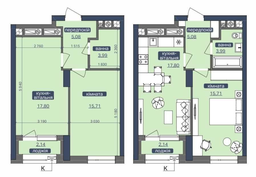 Планування: простора кухня-вітальня, спальня, санвузол, балкон